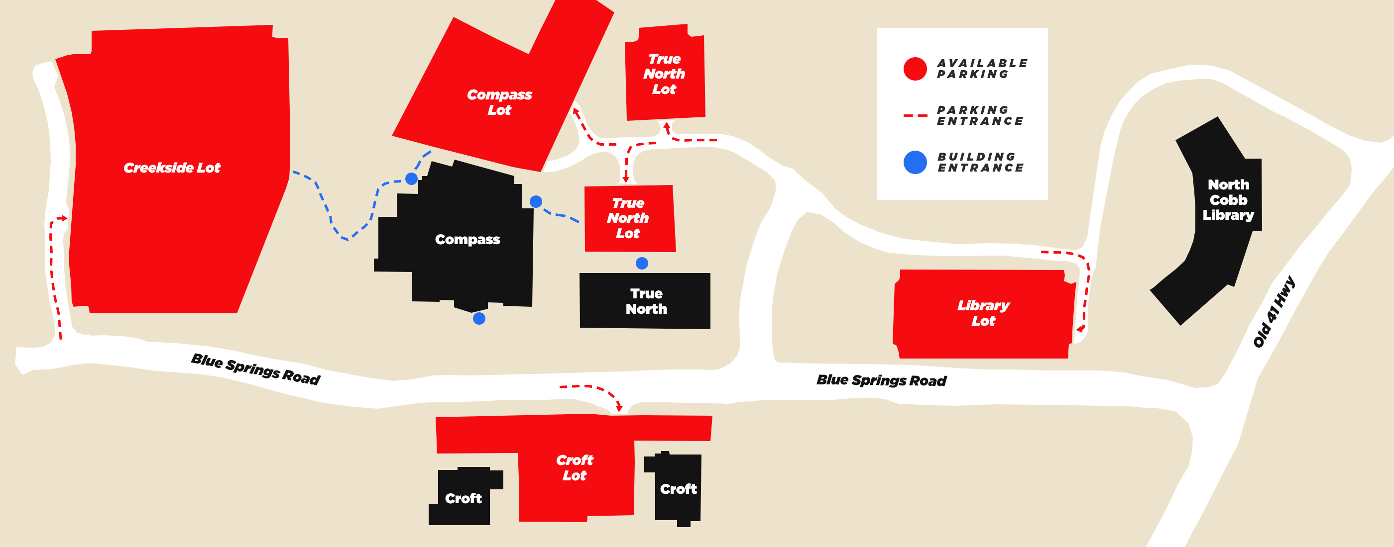 All of our parking lots will be open and available, so feel free to park in the Compass, True North, Creekside, Croft or Library parking lots.
